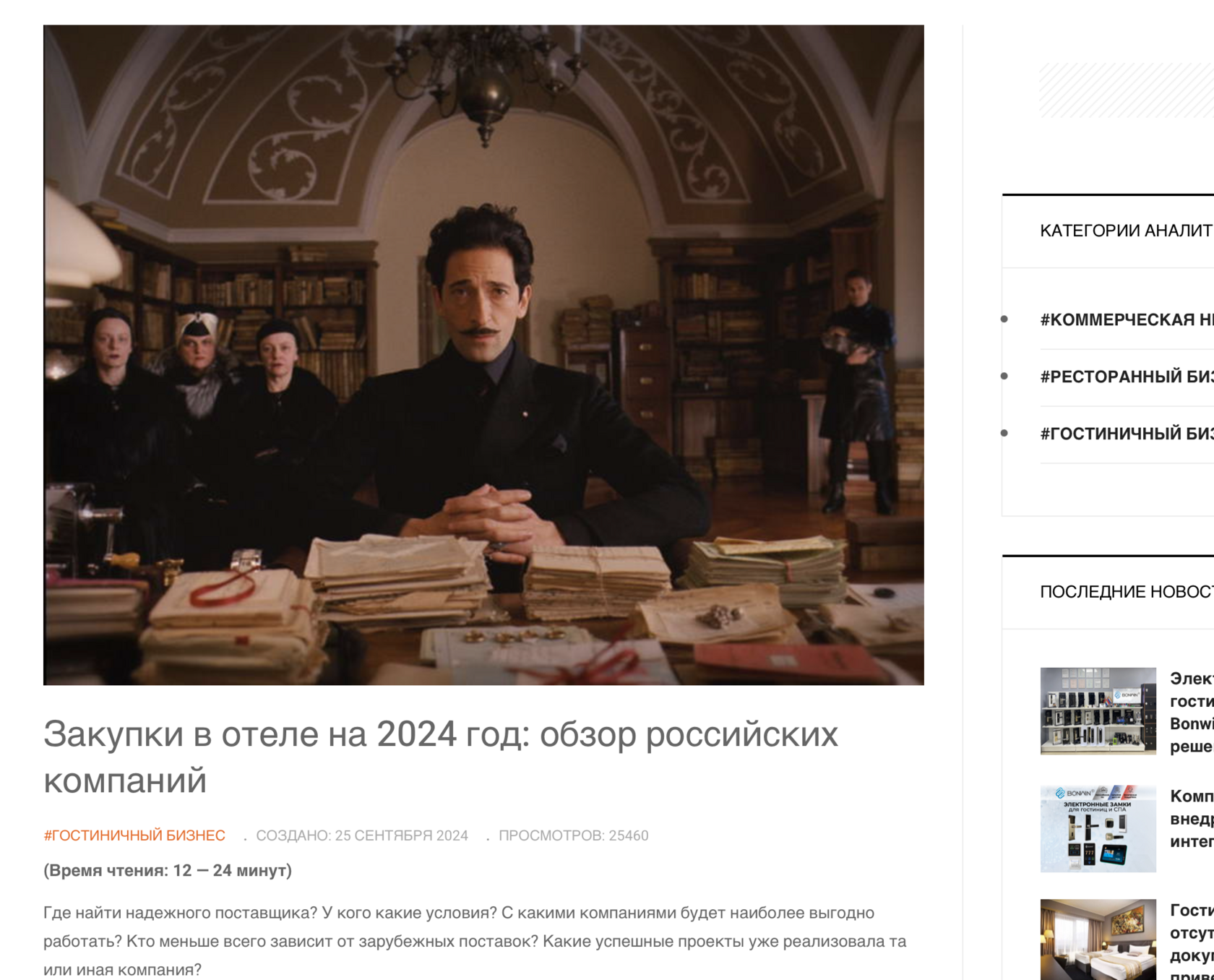 - Обеспечено участие компании в Круглом столе перед выступлениями экспертов на выставке Hospitality Online Expo. По итогам круглого стола подготовлена статья с участие эксперта компании. Автоматизация и комплектация отелей 2024-2025: новинки и перспективы