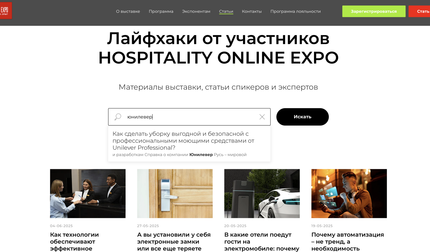 - По итогам выставки подготовлена статья Как сделать уборку выгодной и безопасной с профессиональными моющими средствами от Unilever Professional, размещенная в блоге выставки Hospitality Online Expo. Статья также передана клиенту для использования на своих ресурсах.